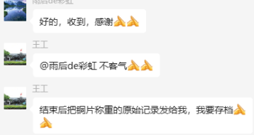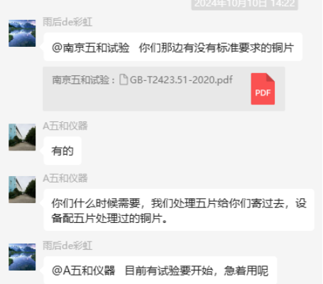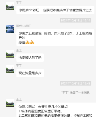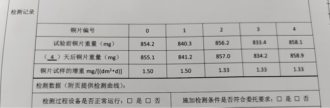 為了更好地說明銅片試驗(yàn)的重要性,下面分享一個(gè)檢測(cè)公司的銅片試驗(yàn)實(shí)際案例:2024年8月份合肥******檢測(cè)技術(shù)有限公司第一次采購我司一臺(tái)型號(hào)為“WHQ-300B”型的混合氣體腐蝕試驗(yàn)箱,設(shè)備被運(yùn)送到客戶指定的場(chǎng)地安裝調(diào)試運(yùn)行。安裝調(diào)試后,客戶后期自行進(jìn)行一次銅片增重試驗(yàn),我司技術(shù)人員進(jìn)行線上指導(dǎo)操作,試驗(yàn)結(jié)束之后客戶將數(shù)據(jù)發(fā)給我司,以下是客戶和我司聊天記錄以及客戶做的數(shù)據(jù)信息: